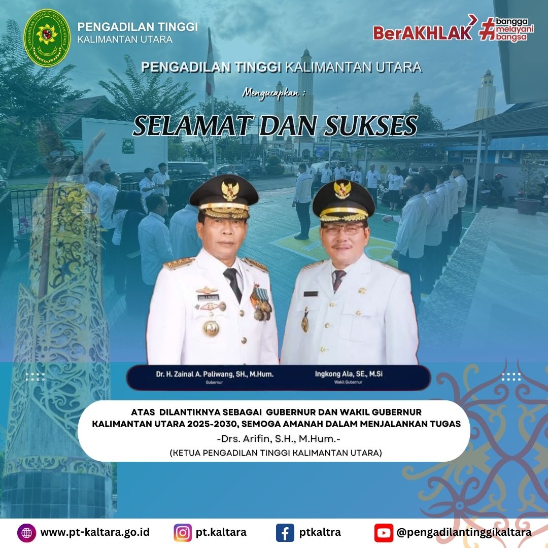 Bulungan, 20 Februari 2025, Ketua Pengadilan Tinggi Kalimantan Utara, Bapak Drs. Arifin.,S.H,,M.Hum Mengucapkan selamat atas dilantiknya Gubernur dan Wakil Gubernur yang baru, Bapak Dr. H. Zainal Paliwang dan bapak Ingkong Ala.,S.E.,M.Si, Semoga senantiasa diberikan kelancaran dan menjaga amanah dalam menjalankan tugas. (Drg)