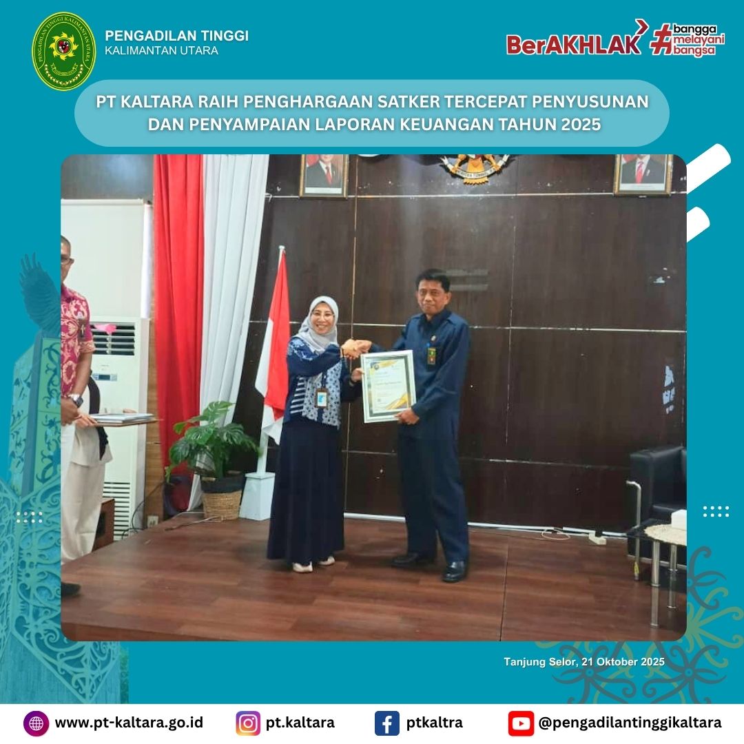 Tanjung Selor, 21 Oktober 2025 — Pengadilan Tinggi Kalimantan Utara kembali menorehkan prestasi membanggakan dengan meraih penghargaan sebagai Satuan Kerja Tercepat dalam Penyusunan dan Penyampaian Laporan Keuangan Tingkat UAPPA-W Periode Semester I Tahun 2025 untuk kategori Jumlah UAKPA sampai dengan 5 (lima).