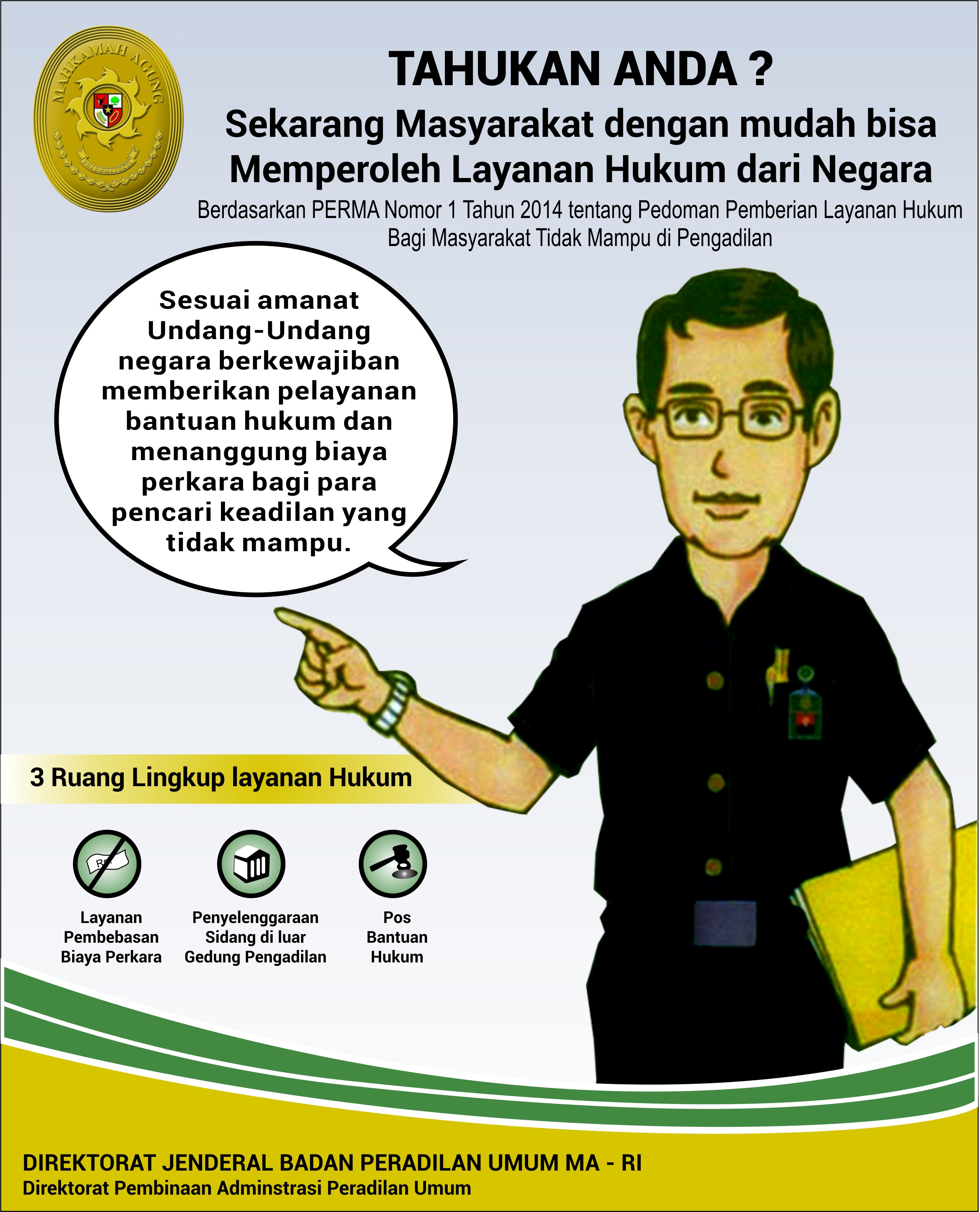 - Peraturan Mahkamah Agung Nomor 1 Tahun 2014 tentang Pedoman Pemberian Layanan Hukum Bagi Masyarakat Tidak Mampu di Pengadilan